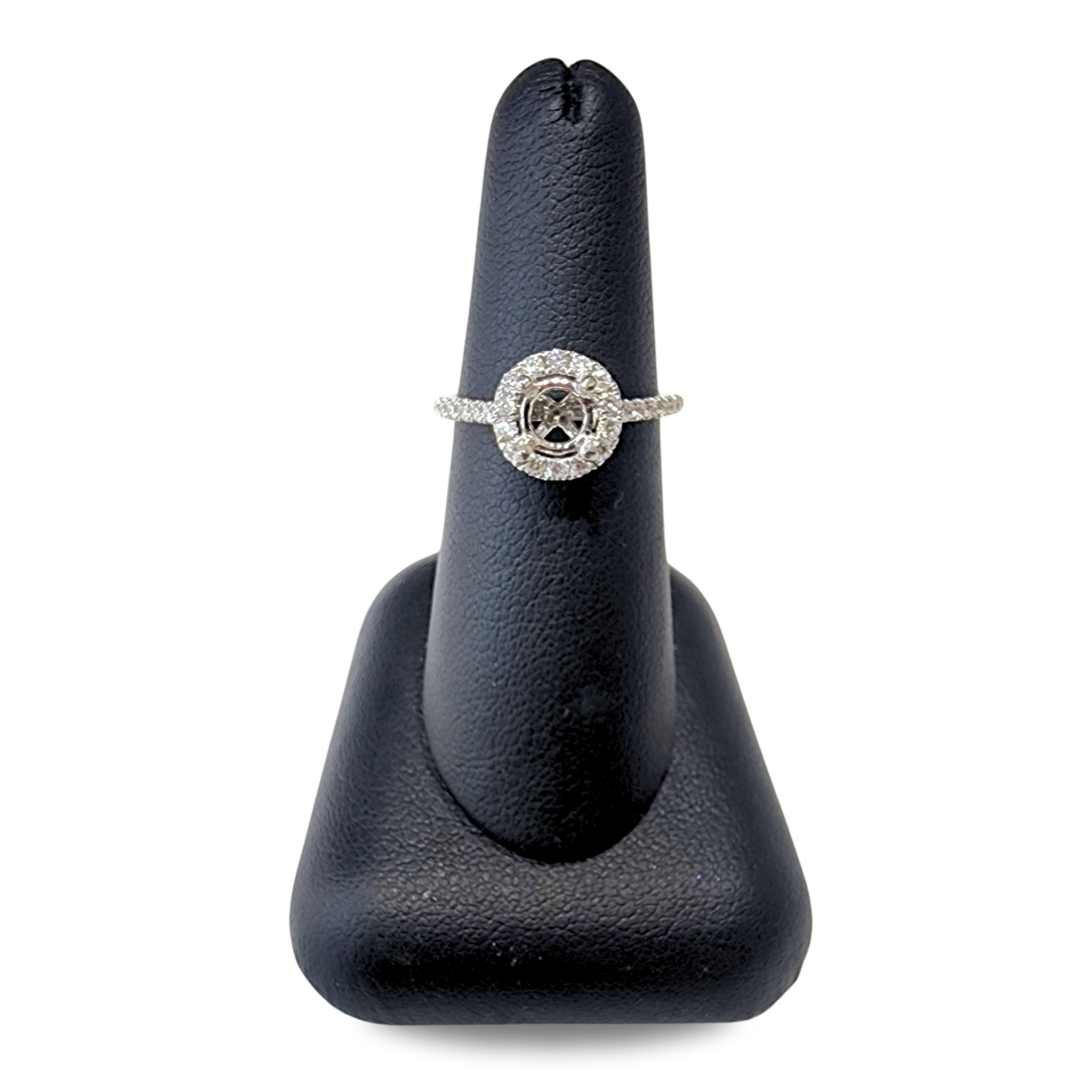 14kt white gold round cut halo diamond semi-mounting. Features prong set natural diamonds that are round cut. TW- .37cts.