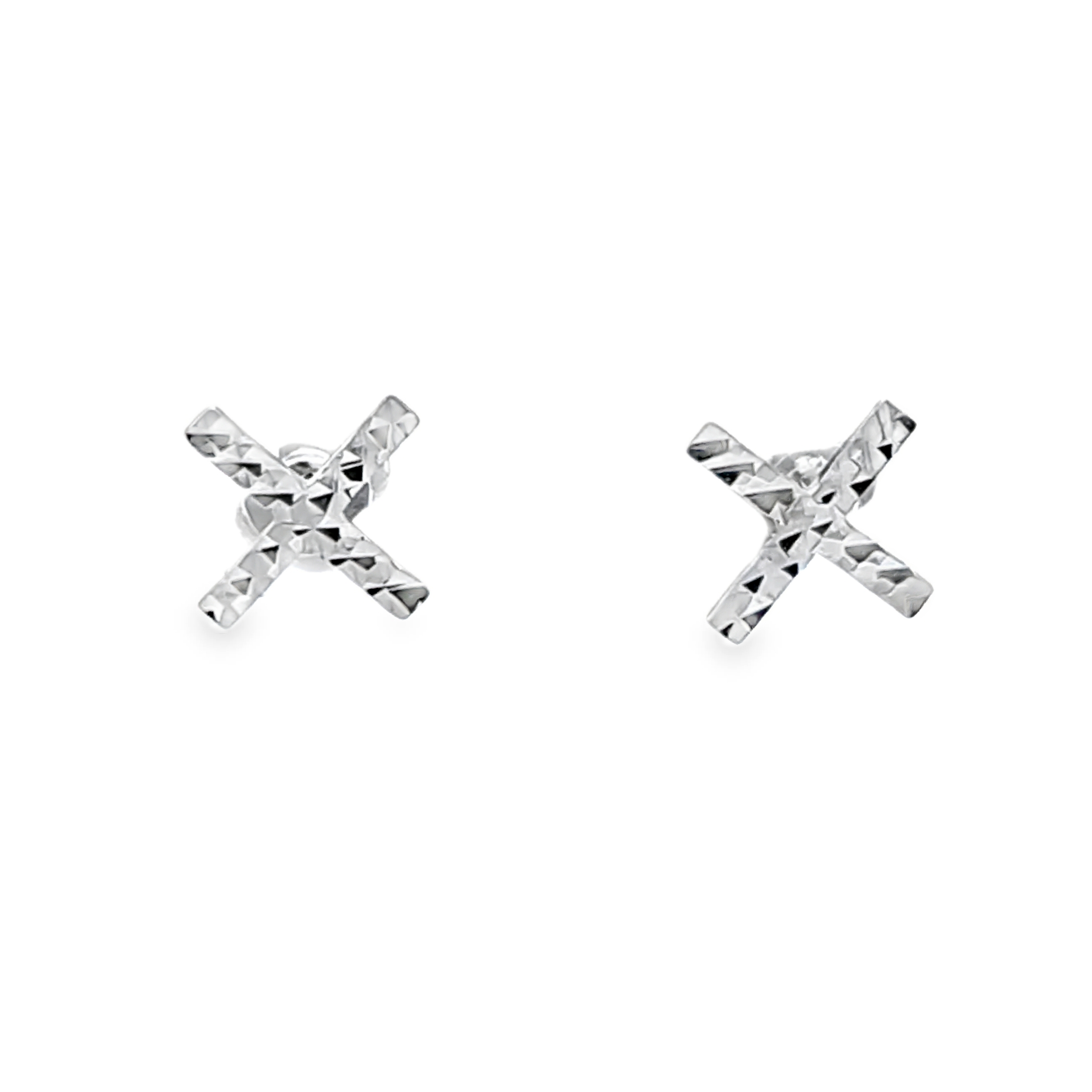 14kt white gold "x" shaped diamond cut design studs with traditional styled posts and backs.