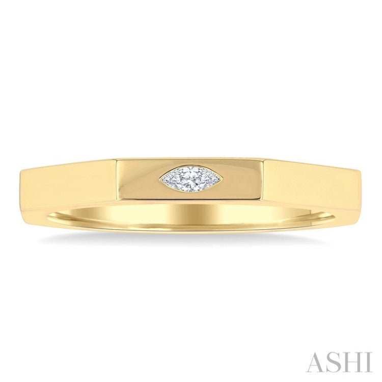 Once a mark of power, identity, and heritage, signet rings date back centuries, historically engraved with family crests or initials and used to seal important documents. Today, they remain a symbol of personal style, legacy, and individuality. Whether worn as a modern heirloom or a refined fashion statement, this diamond signet ring carries the essence of tradition with a contemporary edge. The ring's design features an octagonal shape, with its sleek surface interrupted only by a single bezel set marquise cut diamond gracefully nestled at the center, a delicate yet striking focal point. Styled in a polished finish 14 karat yellow gold, the diamond signet ring blends minimalist design with subtle sophistication. Total diamond weight is 1/20 Ctw.